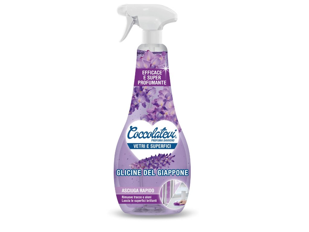 Coccolatevi Detergente per vetri e superfici GLICINE DEL GIAPPONE s inovativním složením je univerzální čistící prostředek na sklo a všechny tvrdé povrchy. Příjemně provoní vaši domácnost a perfektně vyleští okna a další povrchy.
