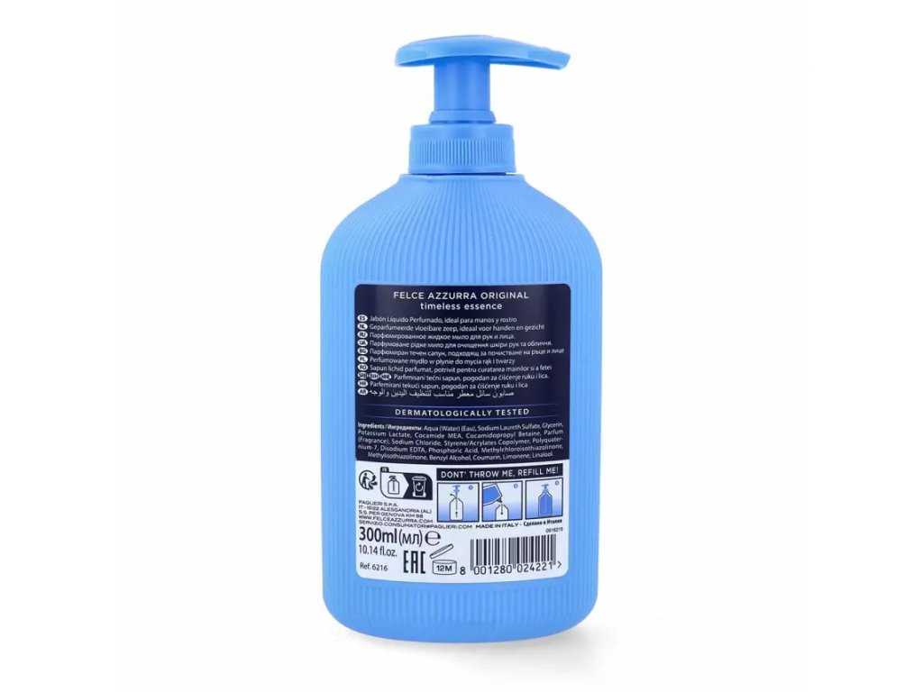 Parfémované tekuté mýdlo Felce Azzurra Classico obohacené o zvlhčující látky jemně čistí, a pomáhá zachovat přirozenou rovnováhu pokožky. Obsahuje glycerin, známý pro své hydratační a zvláčňující vlastnosti. Zanechá pokožku jemnou a provoněnou nezaměnitelnou vůni.
